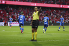Toluca, Estado de México, 7 de febrero de 2026. Luis Enrique Santander, árbitro central, durante el partido correspondiente a la jornada 5 del torneo Clausura 2026 de la Liga BBVA MX, entre los Diablos Rojos del Toluca y la Máquina Celeste del Cruz Azul, realizado en el estadio Nemesio Diez. Foto: Imago7/Daniel Arriaga