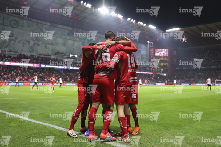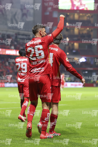 Toluca, Estado de México, 13 de febrero de 2026. Jugadores del Toluca en festejo de gol, durante el partido correspondiente a la jornada 6 del torneo Clausura 2026 de la Liga BBVA MX, entre los Diablos Rojos del Toluca y los Xolos de Tijuana, realizado en el estadio Nemesio Diez. Foto: Imago7/ Rafael Vadillo