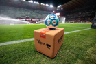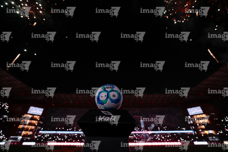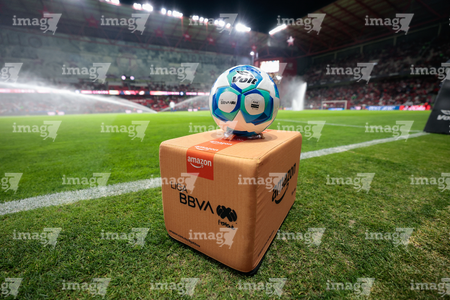 Toluca, Estado de México, 13 de febrero de 2026. Balón de futbol Voit Aereus sobre caja de Amazon, durante el partido correspondiente a la jornada 6 del torneo Clausura 2026 de la Liga BBVA MX, entre los Diablos Rojos del Toluca y los Xolos de Tijuana, realizado en el estadio Nemesio Diez. Foto: Imago7/Daniel Arriaga