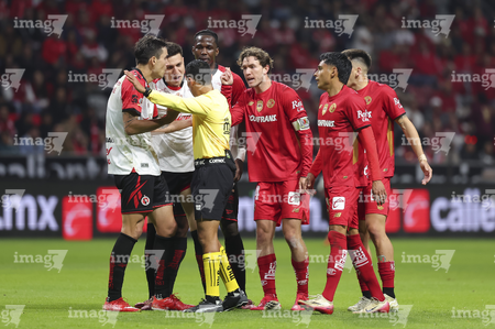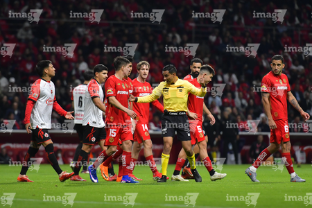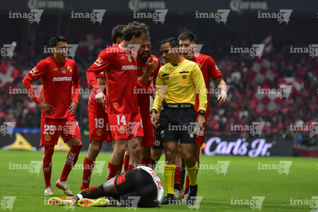 Toluca, Estado de México, 13 de febrero de 2026. Jugadores del Toluca en reclamo a Joaquín Alberto Vizcarra , árbitro central , durante el partido correspondiente a la jornada 6 del torneo Clausura 2026 de la Liga BBVA MX, entre los Diablos Rojos del Toluca y los Xolos de Tijuana, realizado en el estadio Nemesio Diez. Foto: Imago7/ Arturo Hernández