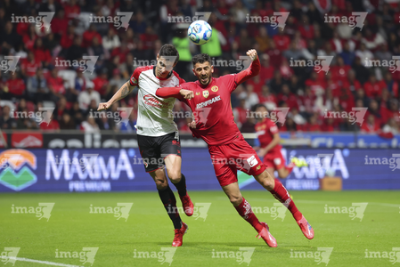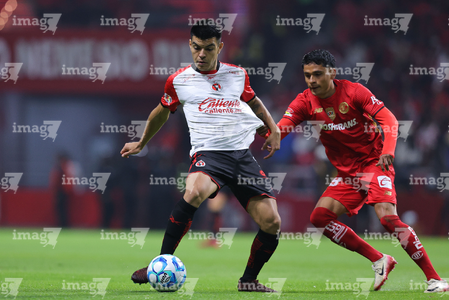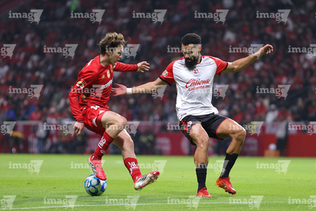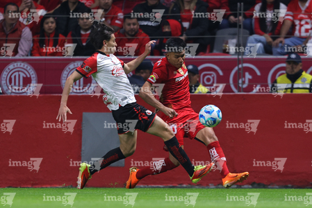 Toluca, Estado de México, 13 de febrero de 2026. Pavel Pérez y José Ignacio Rivero, durante el partido correspondiente a la jornada 6 del torneo Clausura 2026 de la Liga BBVA MX, entre los Diablos Rojos del Toluca y los Xolos de Tijuana, realizado en el estadio Nemesio Diez. Foto: Imago7/ Jesús Esquivel