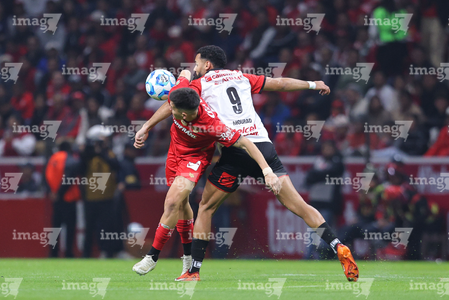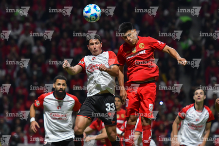 Toluca, Estado de México, 13 de febrero de 2026. Iván Tona y Jorge Díaz Price, durante el partido correspondiente a la jornada 6 del torneo Clausura 2026 de la Liga BBVA MX, entre los Diablos Rojos del Toluca y los Xolos de Tijuana, realizado en el estadio Nemesio Diez. Foto: Imago7/ Jesús Esquivel
