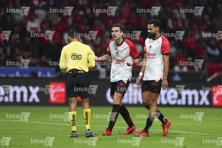 Toluca, Estado de México, 13 de febrero de 2026. Ramiro Árciga y Jesús Gallardo, durante el partido correspondiente a la jornada 6 del torneo Clausura 2026 de la Liga BBVA MX, entre los Diablos Rojos del Toluca y los Xolos de Tijuana, realizado en el estadio Nemesio Diez. Foto: Imago7/ Jesús Esquivel