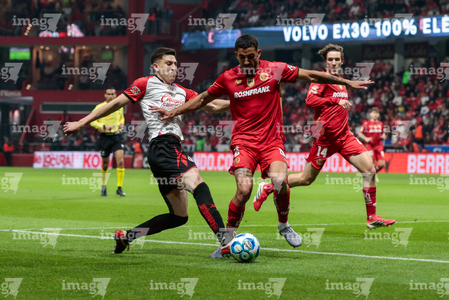 Toluca, Estado de México, 13 de febrero de 2026. Franco Romero y Mourad Daoudi, durante el partido correspondiente a la jornada 6 del torneo Clausura 2026 de la Liga BBVA MX, entre los Diablos Rojos del Toluca y los Xolos de Tijuana, realizado en el estadio Nemesio Diez. Foto: Imago7/ Jesús Esquivel