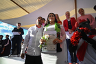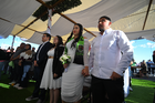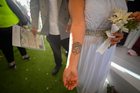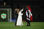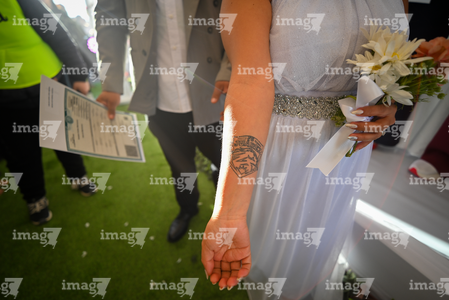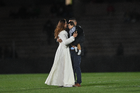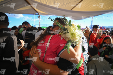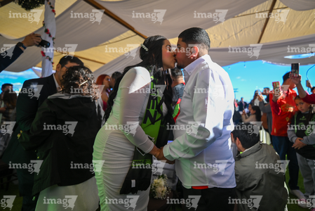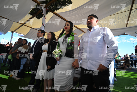 Ciudad Juárez, Chihuahua, 14 de febrero de 2026. Parejas contraen matrimonio en la explanada del estadio en bodas colectivas organizadas por FC Juárez, durante el partido correspondiente a la jornada 6 del torneo Clausura 2026 de la Liga BBVA MX, entre los Bravos de FC Juárez y los Rayos del Necaxa, realizado en realizado en el estadio Olímpico Benito Juárez. Foto: Imago7/ José Zamora