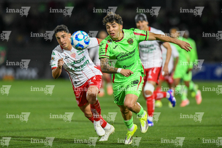 Ciudad Juárez, Chihuahua, 14 de febrero de 2026. Luca Martínez Dupuy y Agustín Oliveros, durante el partido correspondiente a la jornada 6 del torneo Clausura 2026 de la Liga BBVA MX, entre los Bravos de FC Juárez y los Rayos del Necaxa, realizado en realizado en el estadio Olímpico Benito Juárez. Foto: Imago7/Alejandro Rodríguez