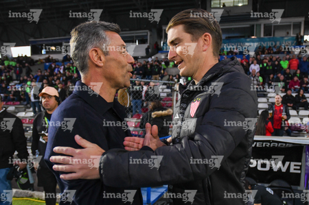 Ciudad Juárez, Chihuahua, 14 de febrero de 2026. Pedro Caixinha y Martin Varini, durante el partido correspondiente a la jornada 6 del torneo Clausura 2026 de la Liga BBVA MX, entre los Bravos de FC Juárez y los Rayos del Necaxa, realizado en realizado en el estadio Olímpico Benito Juárez. Foto: Imago7/Alejandro Rodríguez