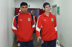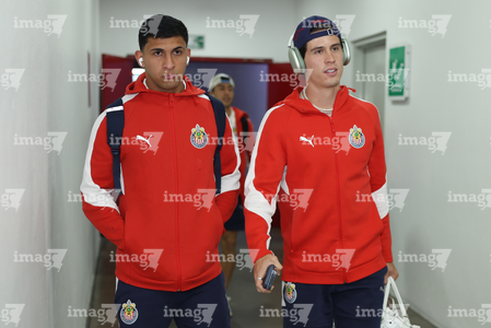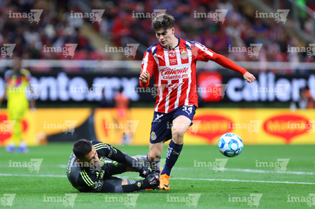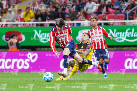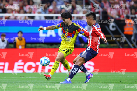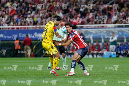 Zapopan, Jalisco, 14 de febrero de 2026. Cristian Borja y Roberto Alvarado "Piojo", durante el partido correspondiente a la jornada 6 del torneo Clausura 2026 de la Liga BBVA MX, entre las Chivas Rayadas del Guadalajara y las Águilas del América, realizado en el estadio Akron. Foto: Imago7/ Juan Carlos Cubeyro.