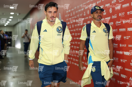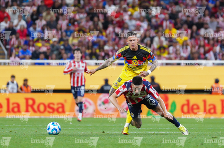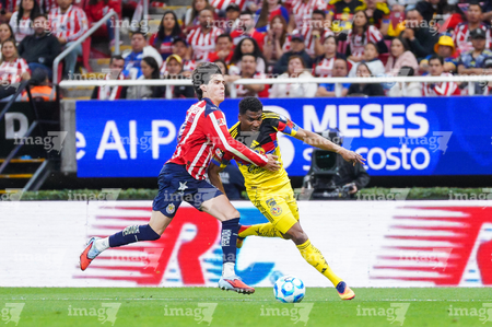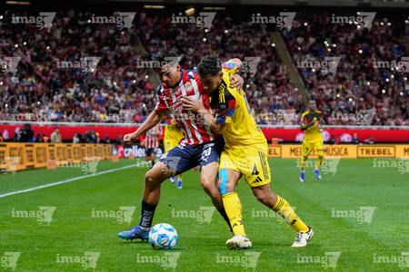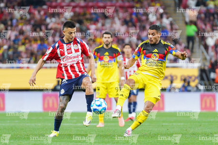 Zapopan, Jalisco, 14 de febrero de 2026. Efraín Álvarez e Israel Reyes, durante el partido correspondiente a la jornada 6 del torneo Clausura 2026 de la Liga BBVA MX, entre las Chivas Rayadas del Guadalajara y las Águilas del América, realizado en el estadio Akron. Foto: Imago7/ Juan Carlos Cubeyro.