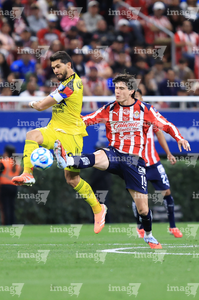 Zapopan, Jalisco, 14 de febrero de 2026. Víctor Dávila y Efraín Álvarez, durante el partido correspondiente a la jornada 6 del torneo Clausura 2026 de la Liga BBVA MX, entre las Chivas Rayadas del Guadalajara y las Águilas del América, realizado en el estadio Akron. Foto: Imago7/ Juan Carlos Cubeyro.