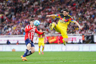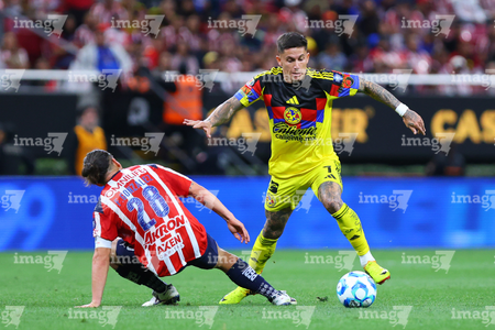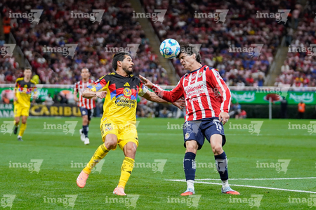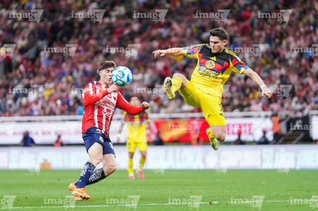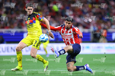 Zapopan, Jalisco, 14 de febrero de 2026. Raphael Veiga y José Castillo, durante el partido correspondiente a la jornada 6 del torneo Clausura 2026 de la Liga BBVA MX, entre las Chivas Rayadas del Guadalajara y las Águilas del América, realizado en el estadio Akron. Foto: Imago7/ Juan Carlos Cubeyro.