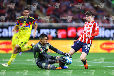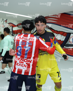 Zapopan, Jalisco, 14 de febrero de 2026. Ángel Malagón y Armando González, durante el partido correspondiente a la jornada 6 del torneo Clausura 2026 de la Liga BBVA MX, entre las Chivas Rayadas del Guadalajara y las Águilas del América, realizado en el estadio Akron. Foto: Imago7/ Juan Carlos Cubeyro.
