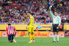Zapopan, Jalisco, 14 de febrero de 2026. Richard Ledezma, durante el partido correspondiente a la jornada 6 del torneo Clausura 2026 de la Liga BBVA MX, entre las Chivas Rayadas del Guadalajara y las Águilas del América, realizado en el estadio Akron. Foto: Imago7/ Juan Carlos Cubeyro.