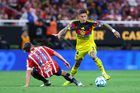 Zapopan, Jalisco, 14 de febrero de 2026. Efraín Álvarez y Jonathan Dos Santos, durante el partido correspondiente a la jornada 6 del torneo Clausura 2026 de la Liga BBVA MX, entre las Chivas Rayadas del Guadalajara y las Águilas del América, realizado en el estadio Akron. Foto: Imago7/ Juan Carlos Cubeyro.