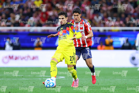 Zapopan, Jalisco, 14 de febrero de 2026. Raphael Veiga y Brian Gutierrez, durante el partido correspondiente a la jornada 6 del torneo Clausura 2026 de la Liga BBVA MX, entre las Chivas Rayadas del Guadalajara y las Águilas del América, realizado en el estadio Akron. Foto: Imago7/ Juan Carlos Cubeyro.