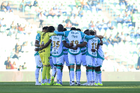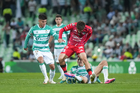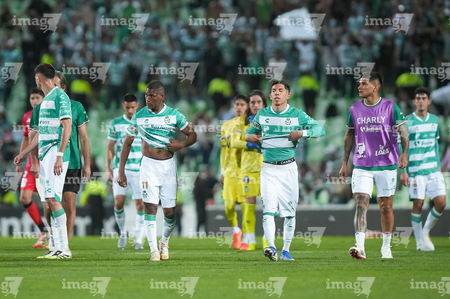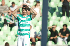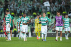 Torreón, Coahuila, 15 de febrero de 2026. Jugadores del Santos Laguna en lamento, durante el partido correspondiente a la jornada 6 del torneo Clausura 2026 de la Liga BBVA MX, entre los Guerreros de Santos Laguna y los Cañoneros del Mazatlán FC, realizado en el estadio Corona. Foto: Imago7/ Erick Saavedra
