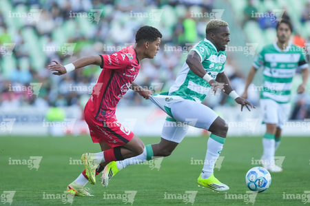 Torreón, Coahuila, 15 de febrero de 2026. Cristian Dajome y Jair Díaz, durante el partido correspondiente a la jornada 6 del torneo Clausura 2026 de la Liga BBVA MX, entre los Guerreros de Santos Laguna y los Cañoneros del Mazatlán FC, realizado en el estadio Corona. Foto: Imago7/ Erick Saavedra