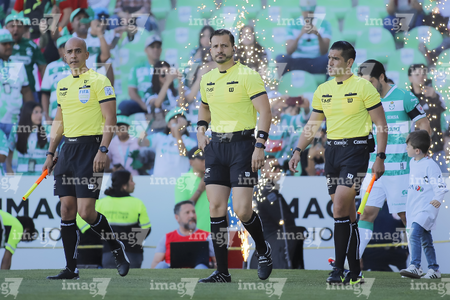 Torreón, Coahuila, 15 de febrero de 2026. Árbitros, durante el partido correspondiente a la jornada 6 del torneo Clausura 2026 de la Liga BBVA MX, entre los Guerreros de Santos Laguna y los Cañoneros del Mazatlán FC, realizado en el estadio Corona. Foto: Imago7/ Saul Perales