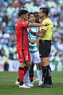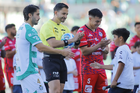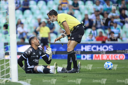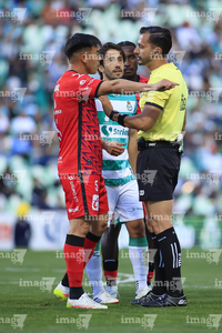 Torreón, Coahuila, 15 de febrero de 2026. Ricardo Rodríguez y Luis Alfredo García, árbitro central, durante el partido correspondiente a la jornada 6 del torneo Clausura 2026 de la Liga BBVA MX, entre los Guerreros de Santos Laguna y los Cañoneros del Mazatlán FC, realizado en el estadio Corona. Foto: Imago7/ Saul Perales
