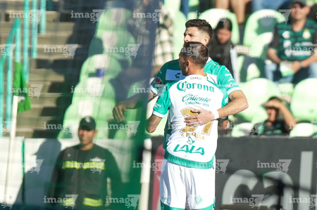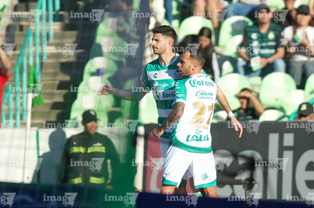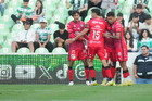 Torreón, Coahuila, 15 de febrero de 2026. Jugadores del Santos Laguna en festejo de gol, durante el partido correspondiente a la jornada 6 del torneo Clausura 2026 de la Liga BBVA MX, entre los Guerreros de Santos Laguna y los Cañoneros del Mazatlán FC, realizado en el estadio Corona. Foto: Imago7/ Erick Saavedra