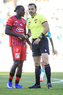 Torreón, Coahuila, 15 de febrero de 2026. Dudu Teodora y Luis Alfredo García, árbitro central, durante el partido correspondiente a la jornada 6 del torneo Clausura 2026 de la Liga BBVA MX, entre los Guerreros de Santos Laguna y los Cañoneros del Mazatlán FC, realizado en el estadio Corona. Foto: Imago7/ Saul Perales