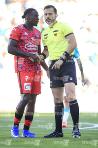 Torreón, Coahuila, 15 de febrero de 2026. Facundo Almada y Luis Alfredo García, árbitro central, durante el partido correspondiente a la jornada 6 del torneo Clausura 2026 de la Liga BBVA MX, entre los Guerreros de Santos Laguna y los Cañoneros del Mazatlán FC, realizado en el estadio Corona. Foto: Imago7/ Saul Perales