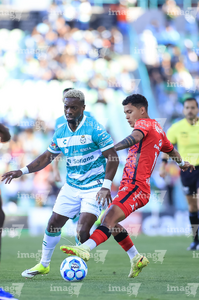 Torreón, Coahuila, 15 de febrero de 2026. Brian Rubio y Kevin Balanta, durante el partido correspondiente a la jornada 6 del torneo Clausura 2026 de la Liga BBVA MX, entre los Guerreros de Santos Laguna y los Cañoneros del Mazatlán FC, realizado en el estadio Corona. Foto: Imago7/ Erick Saavedra