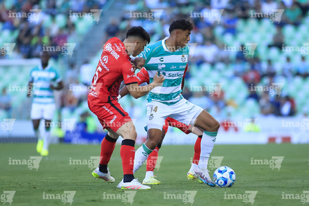 Torreón, Coahuila, 15 de febrero de 2026. Kevin Palacios y Sebastián Santos durante el partido correspondiente a la jornada 6 del torneo Clausura 2026 de la Liga BBVA MX, entre los Guerreros de Santos Laguna y los Cañoneros del Mazatlán FC, realizado en el estadio Corona. Foto: Imago7/ Erick Saavedra