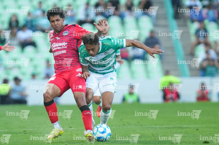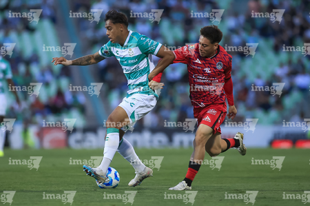 Torreón, Coahuila, 15 de febrero de 2026. Sebastán Santos y Edgar Bárcenas, durante el partido correspondiente a la jornada 6 del torneo Clausura 2026 de la Liga BBVA MX, entre los Guerreros de Santos Laguna y los Cañoneros del Mazatlán FC, realizado en el estadio Corona. Foto: Imago7/ Saul Perales
