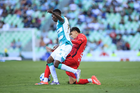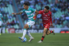 Torreón, Coahuila, 15 de febrero de 2026. Ricardo Rodríguez y Lucas Di Yorio, durante el partido correspondiente a la jornada 6 del torneo Clausura 2026 de la Liga BBVA MX, entre los Guerreros de Santos Laguna y los Cañoneros del Mazatlán FC, realizado en el estadio Corona. Foto: Imago7/ Erick Saavedra