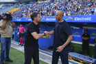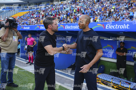 Puebla, Puebla, 15 de febrero de 2026. Nicolás Larcamón y Gudo Pizarro, Directores Técnicos, durante el partido correspondiente a la jornada 6 del torneo Clausura 2026 de la Liga BBVA MX, entre la Máquina Celeste del Cruz Azul y los Tigres de la UANL, realizado en el estadio Cuauhtémoc. Foto: Imago7/ Manlio Contreras