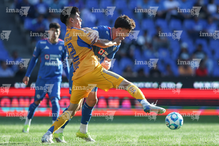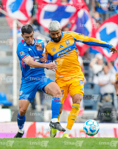 Puebla, Puebla, 15 de febrero de 2026. Erik Lira y Rodrigo Aguirre, durante el partido correspondiente a la jornada 6 del torneo Clausura 2026 de la Liga BBVA MX, entre la Máquina Celeste del Cruz Azul y los Tigres de la UANL, realizado en el estadio Cuauhtémoc. Foto: Imago7/ Diego Padilla