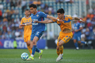 Puebla, Puebla, 15 de febrero de 2026. Ángel Correa y Agustín Palavecino, durante el partido correspondiente a la jornada 6 del torneo Clausura 2026 de la Liga BBVA MX, entre la Máquina Celeste del Cruz Azul y los Tigres de la UANL, realizado en el estadio Cuauhtémoc. Foto: Imago7/Mireya Novo