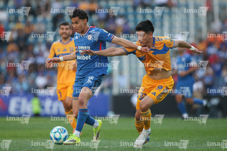 Puebla, Puebla, 15 de febrero de 2026. Omar Campos y Marcelo Flores, durante el partido correspondiente a la jornada 6 del torneo Clausura 2026 de la Liga BBVA MX, entre la Máquina Celeste del Cruz Azul y los Tigres de la UANL, realizado en el estadio Cuauhtémoc. Foto: Imago7/ Diego Alducin