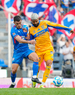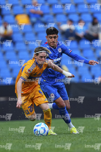 Puebla, Puebla, 15 de febrero de 2026. Jeremy Márquez y Joaquim Pereira durante el partido correspondiente a la jornada 6 del torneo Clausura 2026 de la Liga BBVA MX, entre la Máquina Celeste del Cruz Azul y los Tigres de la UANL, realizado en el estadio Cuauhtémoc. Foto: Imago7/Mireya Novo