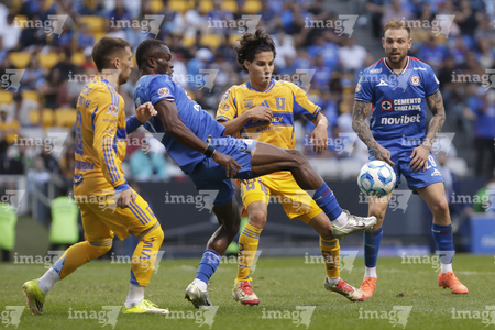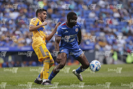 Puebla, Puebla, 15 de febrero de 2026. Jesús Garza y Christian Ebere durante el partido correspondiente a la jornada 6 del torneo Clausura 2026 de la Liga BBVA MX, entre la Máquina Celeste del Cruz Azul y los Tigres de la UANL, realizado en el estadio Cuauhtémoc. Foto: Imago7/Mireya Novo