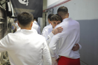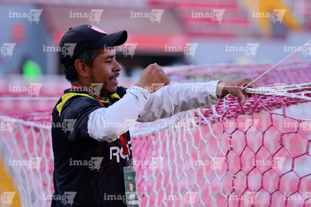 Aguascalientes, Aguascalientes, 21 de febrero de 2026. Personal de mantenimiento, durante el partido correspondiente a la jornada 7 del torneo Clausura 2026 de la Liga BBVA MX, entre los Rayos del Necaxa y los Diablos Rojos del Toluca, realizado en el estadio Victoria. Foto: Imago7/ Pablo Ramírez