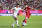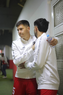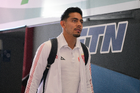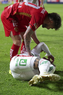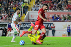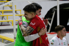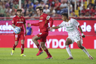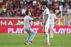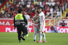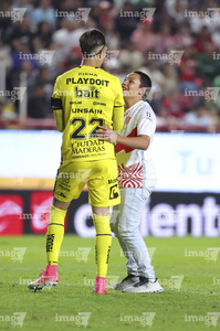 Aguascalientes, Aguascalientes, 21 de febrero de 2026. Emilio Lara y un aficionado que ingresó a la cancha durante el partido correspondiente a la jornada 7 del torneo Clausura 2026 de la Liga BBVA MX, entre los Rayos del Necaxa y los Diablos Rojos del Toluca, realizado en el estadio Victoria. Foto: Imago7/ Rafael Vadillo