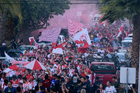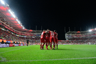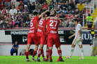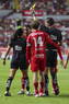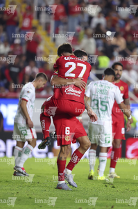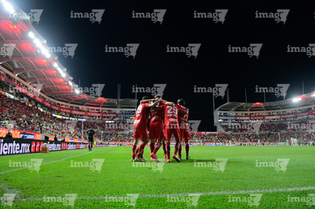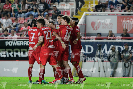 Aguascalientes, Aguascalientes, 21 de febrero de 2026. Jugadores de Necaxa en festejo, durante el partido correspondiente a la jornada 7 del torneo Clausura 2026 de la Liga BBVA MX, entre los Rayos del Necaxa y los Diablos Rojos del Toluca, realizado en el estadio Victoria. Foto: Imago7/ Pablo Ramírez