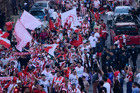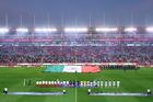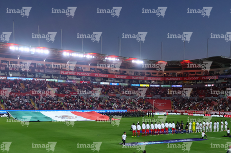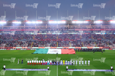 Aguascalientes, Aguascalientes, 21 de febrero de 2026. Protocolo con bandera de México, durante el partido correspondiente a la jornada 7 del torneo Clausura 2026 de la Liga BBVA MX, entre los Rayos del Necaxa y los Diablos Rojos del Toluca, realizado en el estadio Victoria. Foto: Imago7/ Rogelio Davila