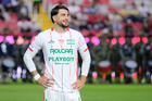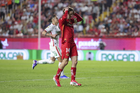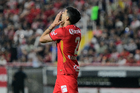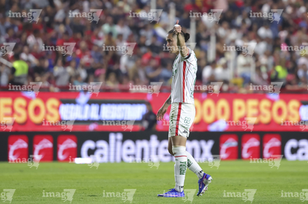 Aguascalientes, Aguascalientes, 21 de febrero de 2026. Cristian Calderón "Chicote" en lamento, durante el partido correspondiente a la jornada 7 del torneo Clausura 2026 de la Liga BBVA MX, entre los Rayos del Necaxa y los Diablos Rojos del Toluca, realizado en el estadio Victoria. Foto: Imago7/ Pablo Ramírez