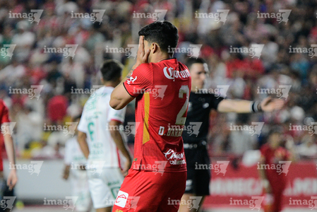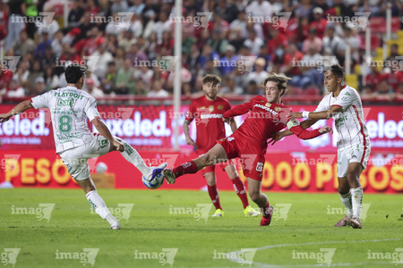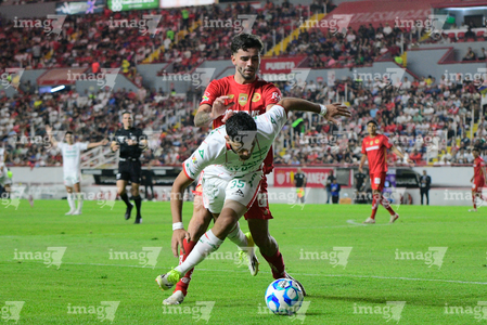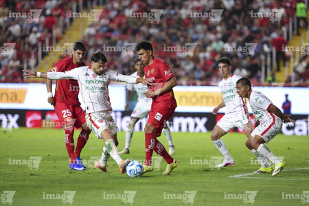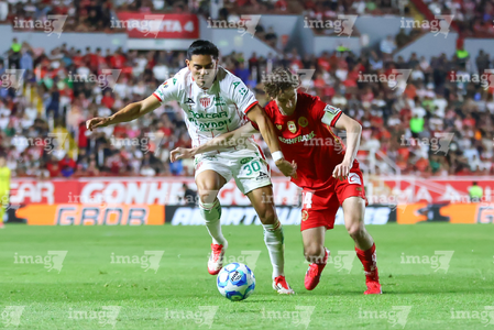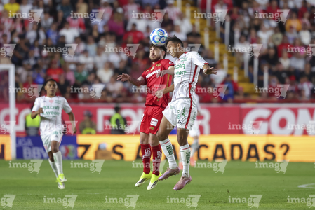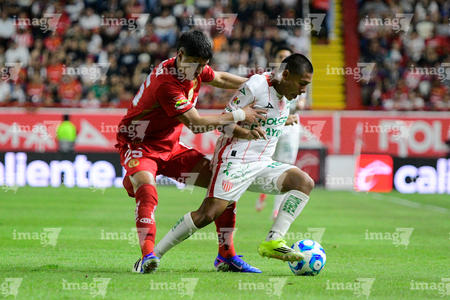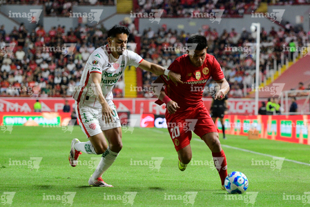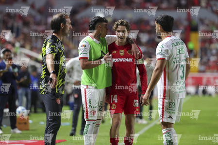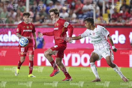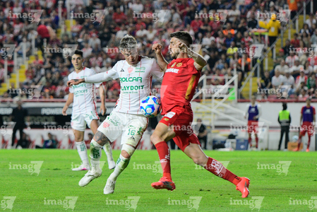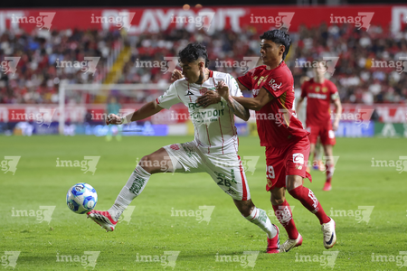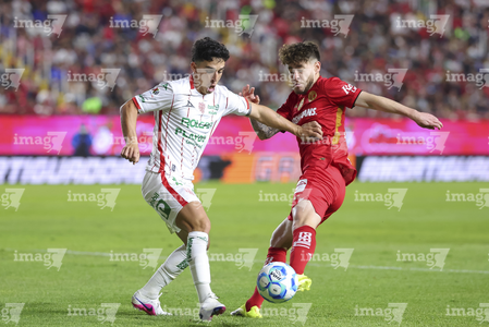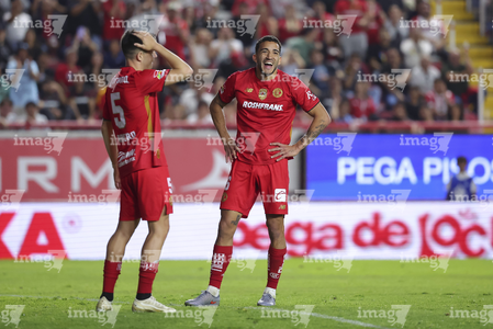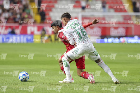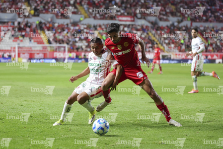 Aguascalientes, Aguascalientes, 21 de febrero de 2026. Jesús Angulo "Canelo" y Daniel Leyva, durante el partido correspondiente a la jornada 7 del torneo Clausura 2026 de la Liga BBVA MX, entre los Rayos del Necaxa y los Diablos Rojos del Toluca, realizado en el estadio Victoria. Foto: Imago7/ Rafael Vadillo