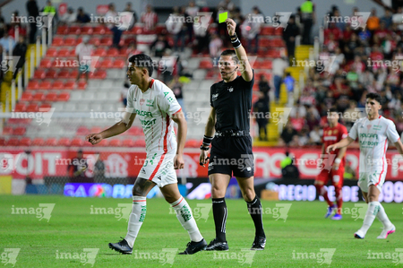Aguascalientes, Aguascalientes, 21 de febrero de 2026. Yonatan Peinado Aguirre, árbitro central muestra tarjeta amarilla de amonestación a Raúl Martínez, durante el partido correspondiente a la jornada 7 del torneo Clausura 2026 de la Liga BBVA MX, entre los Rayos del Necaxa y los Diablos Rojos del Toluca, realizado en el estadio Victoria. Foto: Imago7/ Pablo Ramírez