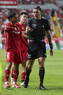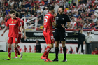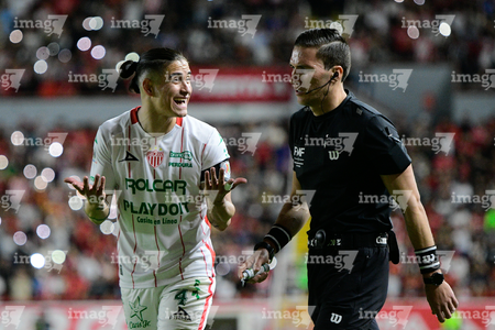 Aguascalientes, Aguascalientes, 21 de febrero de 2026. Diego Barbosa en reclamo a Yonatan Peinado Aguirre, árbitro central, durante el partido correspondiente a la jornada 7 del torneo Clausura 2026 de la Liga BBVA MX, entre los Rayos del Necaxa y los Diablos Rojos del Toluca, realizado en el estadio Victoria. Foto: Imago7/ Rafael Vadillo