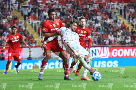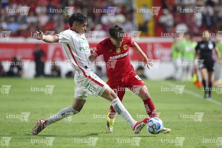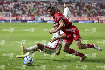 Aguascalientes, Aguascalientes, 21 de febrero de 2026. Emilio Lara y Marcel Ruiz, durante el partido correspondiente a la jornada 7 del torneo Clausura 2026 de la Liga BBVA MX, entre los Rayos del Necaxa y los Diablos Rojos del Toluca, realizado en el estadio Victoria. Foto: Imago7/ Rafael Vadillo
