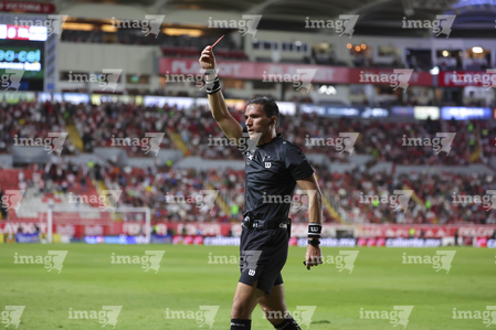 Aguascalientes, Aguascalientes, 21 de febrero de 2026. Yonatan Peinado Aguirre, árbitro central muestra tarjeta roja de expulsión, durante el partido correspondiente a la jornada 7 del torneo Clausura 2026 de la Liga BBVA MX, entre los Rayos del Necaxa y los Diablos Rojos del Toluca, realizado en el estadio Victoria. Foto: Imago7/ Rafael Vadillo