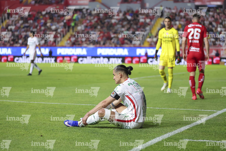 Aguascalientes, Aguascalientes, 21 de febrero de 2026. Marcel Ruiz en lamento, durante el partido correspondiente a la jornada 7 del torneo Clausura 2026 de la Liga BBVA MX, entre los Rayos del Necaxa y los Diablos Rojos del Toluca, realizado en el estadio Victoria. Foto: Imago7/ Rafael Vadillo