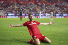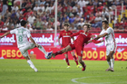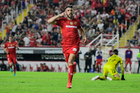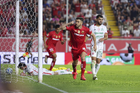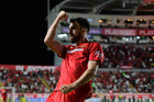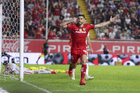 Aguascalientes, Aguascalientes, 21 de febrero de 2026. Paulinho anota gol, durante el partido correspondiente a la jornada 7 del torneo Clausura 2026 de la Liga BBVA MX, entre los Rayos del Necaxa y los Diablos Rojos del Toluca, realizado en el estadio Victoria. Foto: Imago7/ Rafael Vadillo