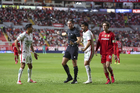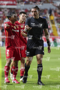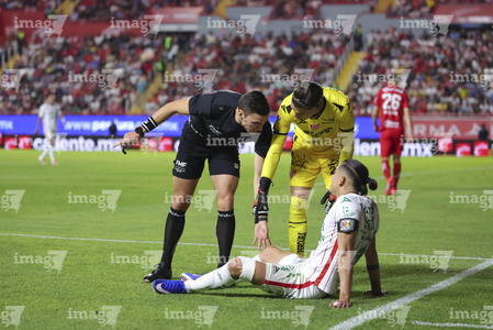Aguascalientes, Aguascalientes, 21 de febrero de 2026. Yonatan Peinado Aguirre, árbitro central y Alexis Peña quien resultó lesionado, durante el partido correspondiente a la jornada 7 del torneo Clausura 2026 de la Liga BBVA MX, entre los Rayos del Necaxa y los Diablos Rojos del Toluca, realizado en el estadio Victoria. Foto: Imago7/ Rafael Vadillo