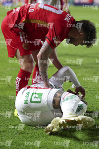 Aguascalientes, Aguascalientes, 21 de febrero de 2026. Jesús Angulo "Canelo" y Cristian Calderón "Chicote" quien resultó lesionado, durante el partido correspondiente a la jornada 7 del torneo Clausura 2026 de la Liga BBVA MX, entre los Rayos del Necaxa y los Diablos Rojos del Toluca, realizado en el estadio Victoria. Foto: Imago7/ Rafael Vadillo